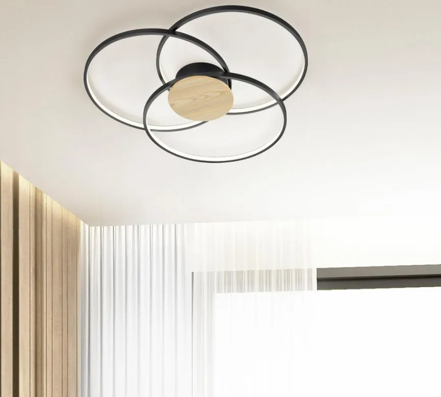 Die LED-Deckenleuchte Sedona von Trio bringt nicht nur Licht ins Dunkle, sie ist ein echter Blickfang zugleich. Die Kombination aus ineinander greifenden Aluminiumkreisen und dem in Holzoptik gestalteten MDF-Mittelelement machen diese LED-Deckenlampe zu einem modernen Hingucker an Ihrer Zimmerdecke. Dank der LED-Technologie ist Energiesparen mit der LED-Deckenleuchte Sedona von Trio leichtgemacht, ohne dabei auf die gewünschte Leuchtkraft zu verzichten.
