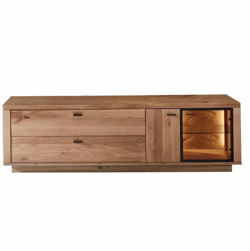 - Front aus Eiche massiv geölt, Korpus aus Holzwerkstoff kratzfester Melaminharzfolie in Eiche Artisan, Türen mit Alurahmen in Schwarzgrau