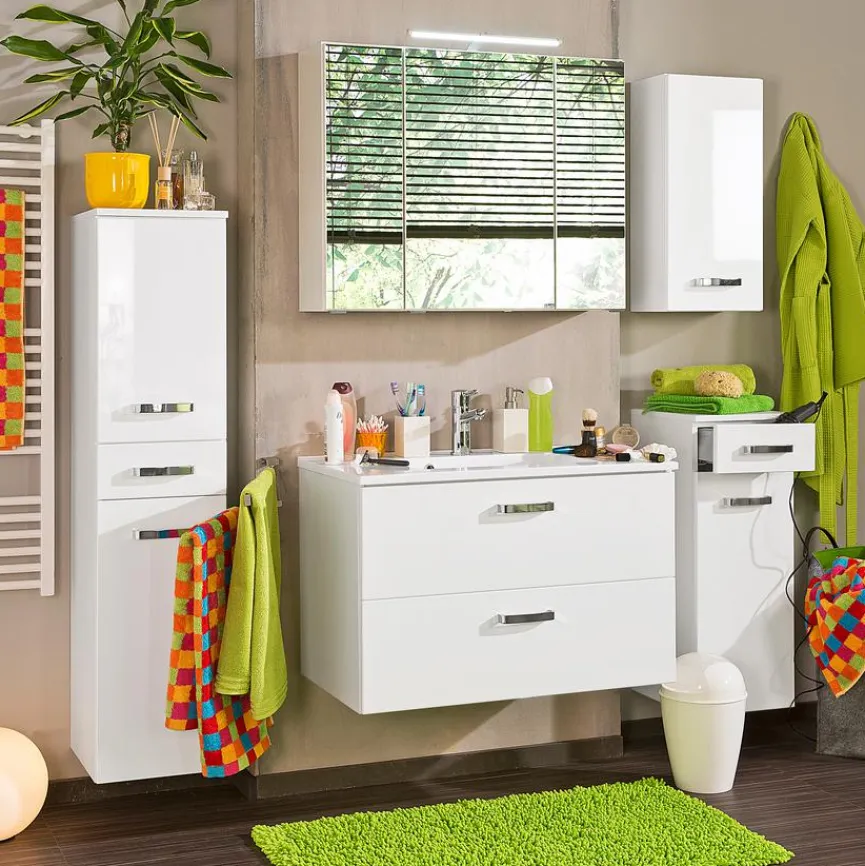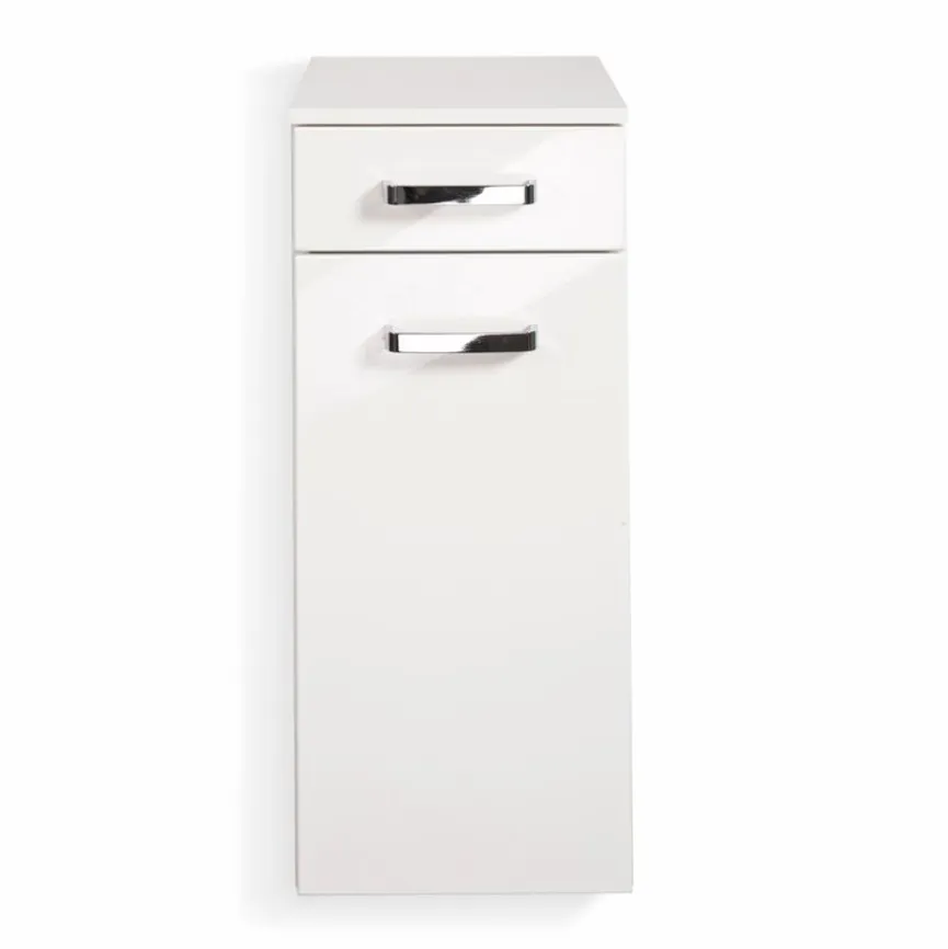 - Front aus Holzwerkstoff (MDF) mit Hochglanzfolie in weiß, Korpus aus Holzwerkstoff (Spanplatte) mit Folie in weiß