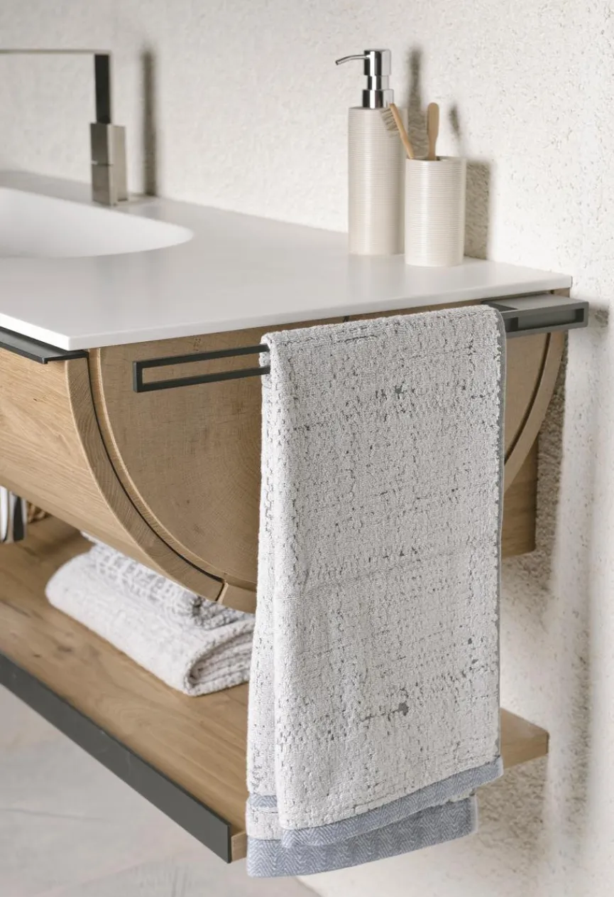 Der renommierte Hersteller Voglauer bietet mit dem Handtuchhalter Vquell ein praktisches Zubehörteil zur Ergänzung der Ausstattung an. Dank seiner schlichten Konstruktion fügt sich der Halter perfekt in seine Umgebung ein. Er lässt sich leicht zum Beispiel am Waschbeckenunterschrank der gleichnamigen Serie anbringen und sorgt so dafür, dass Handtücher ordentlich aufgeräumt trocknen können. So ist der Voglauer Handtuchhalter Vquell zur Perfektionierung des Interieurs eine gute Wahl.