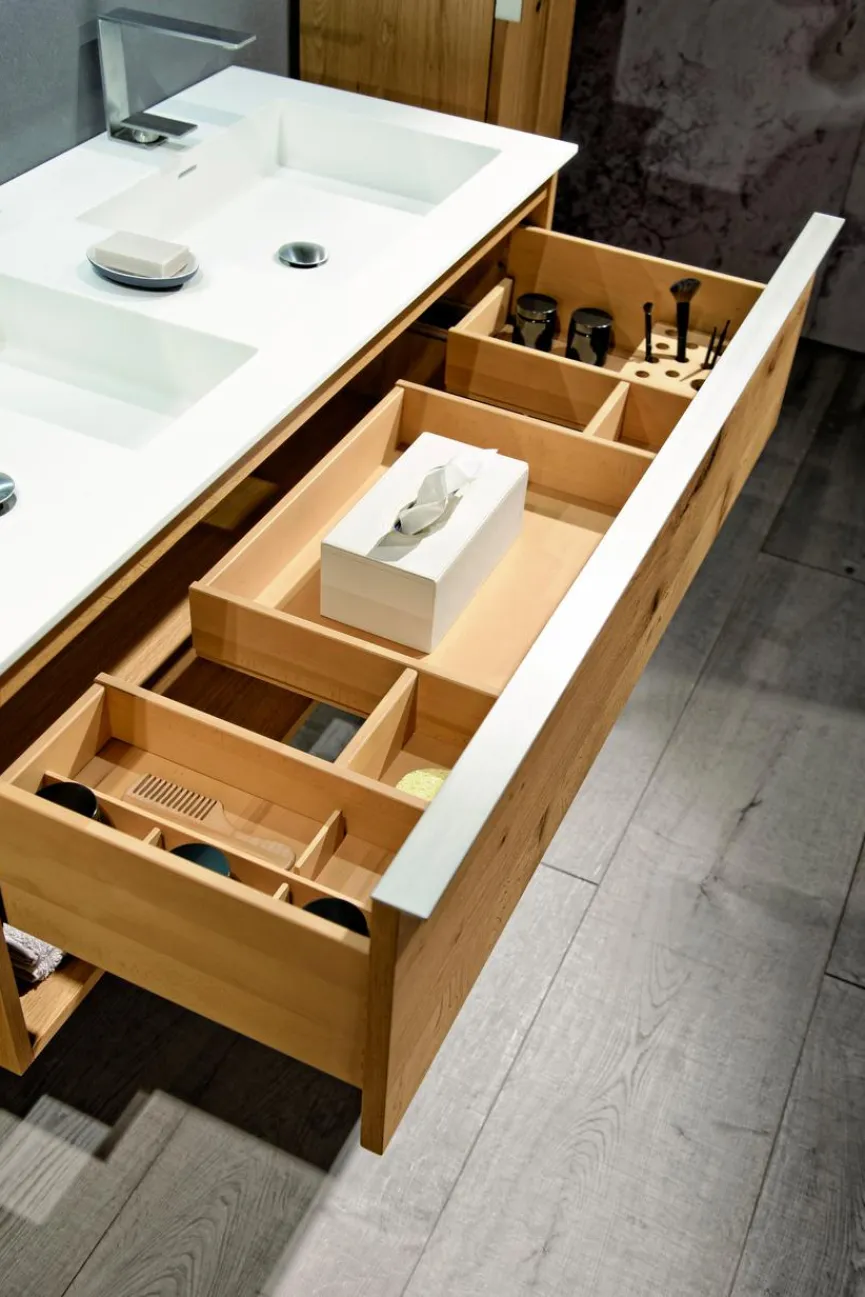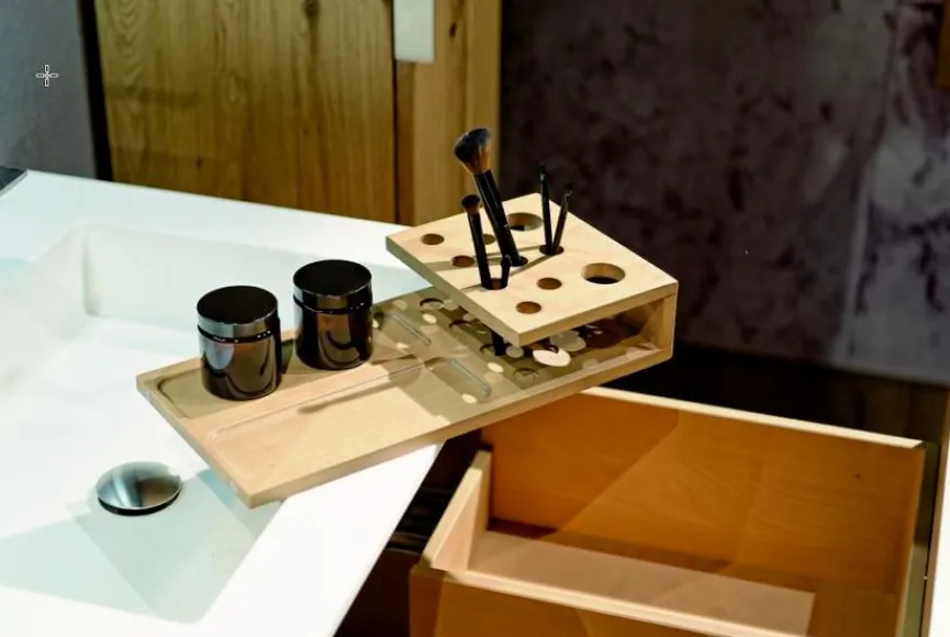 Der Schminkeinsatz BSE19 ist die ideale Ergänzung für Waschtischunterschränke der Marke Voglauer. Dieser praktische Schubladeneinsatz ist so konzipiert, dass Pinsel, Tiegel sowie weitere kleinere Schminkutensilien hier gut sortiert und übersichtlich verstaut werden können. Daher haben Sie mit dem Schminkeinsatz BSE19 von Voglauer immer alles griffbereit, was Sie für Ihr Make-up benötigen.