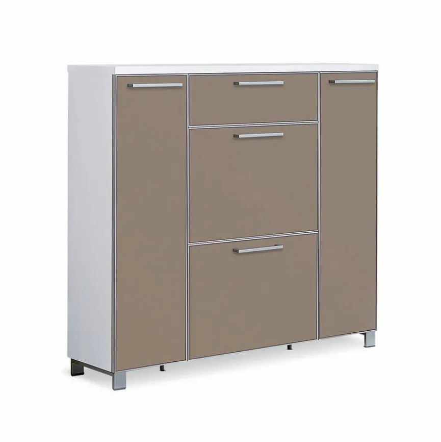 - Front aus Glas in Taupe auf Spanplattenfüllung mit umlaufenden alufarbigen Rahmen