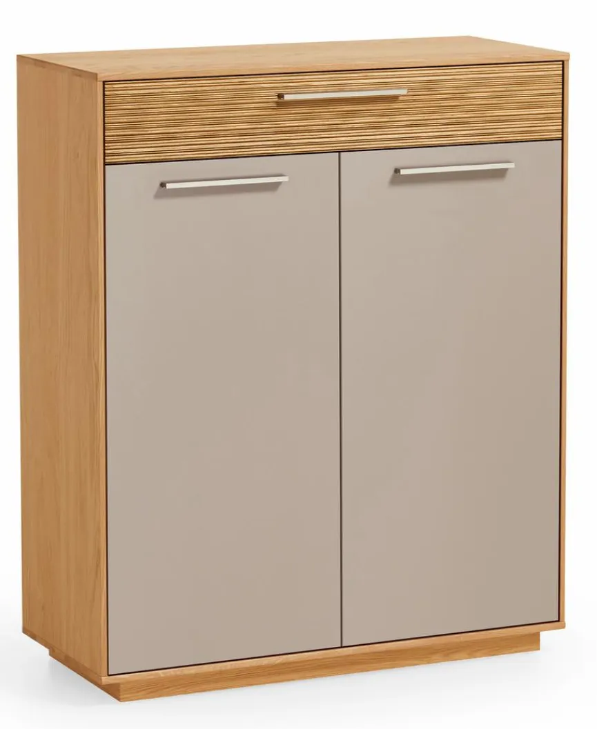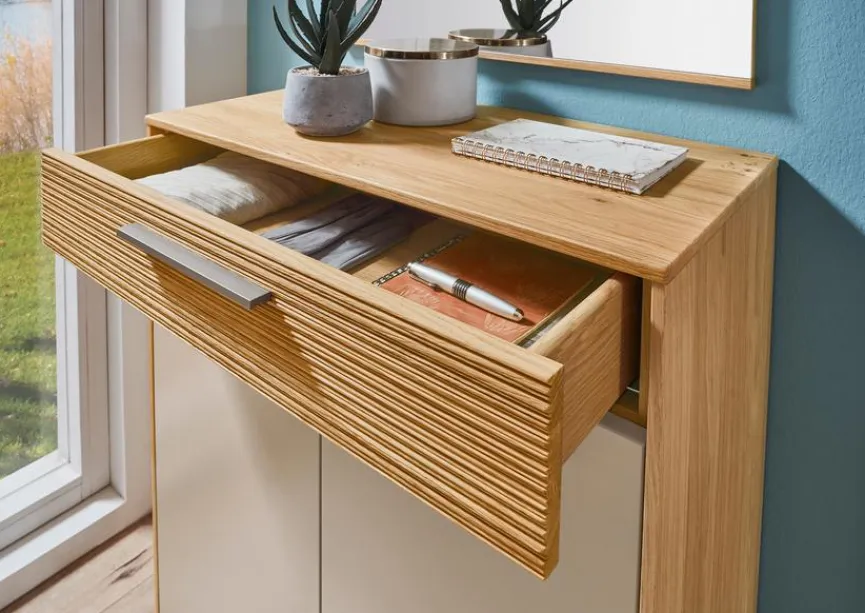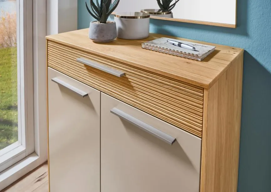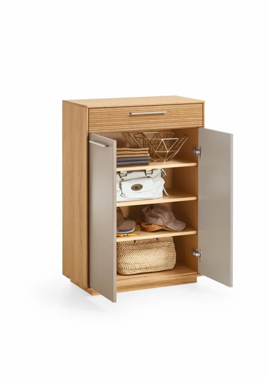Die Schuhkommode Loveno von Voss Möbel passt dank ihrer geringen Tiefe selbst in schmale Flure und Ecken. Mit drei verstellbaren Holzeinlegeböden bietet der Schuhschrank viel übersichtlichen Stauraum. Währenddessen finden im breiten Schubkasten der Voss Möbel Schuhkommode Loveno Schals, Mützen und Handschuhe ein neues Zuhause.