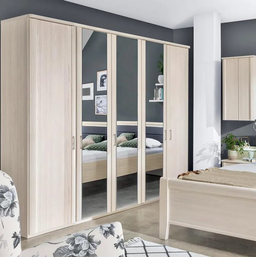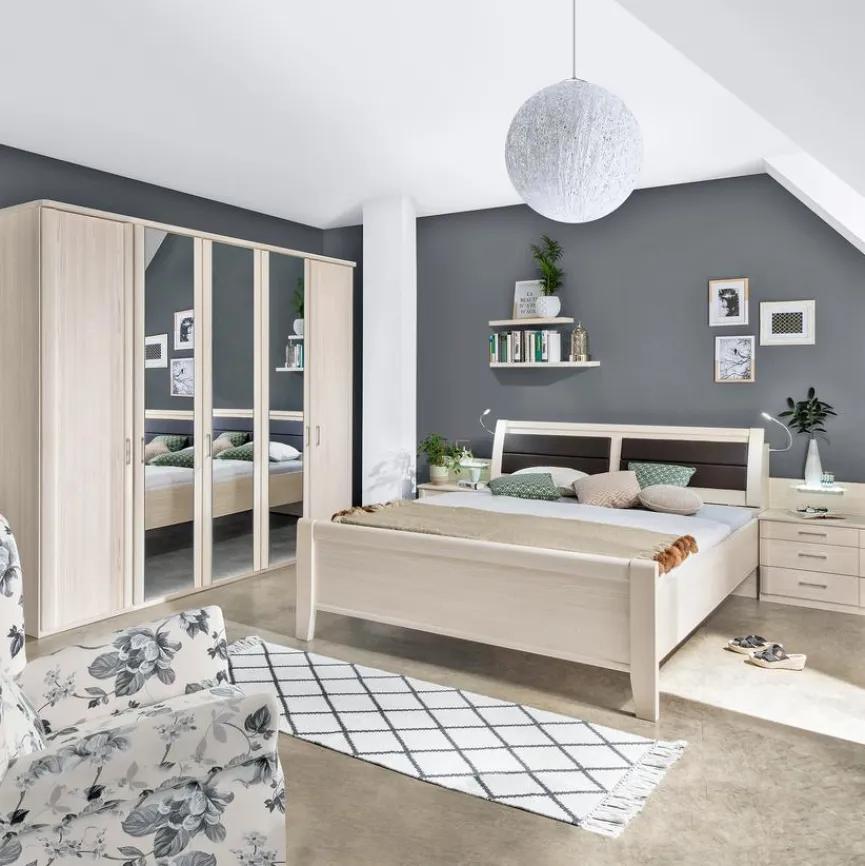 - Set besteht aus Bett 180 x 200 cm, Kleiderschrank 250 x 220 cm und 2x Nachttische