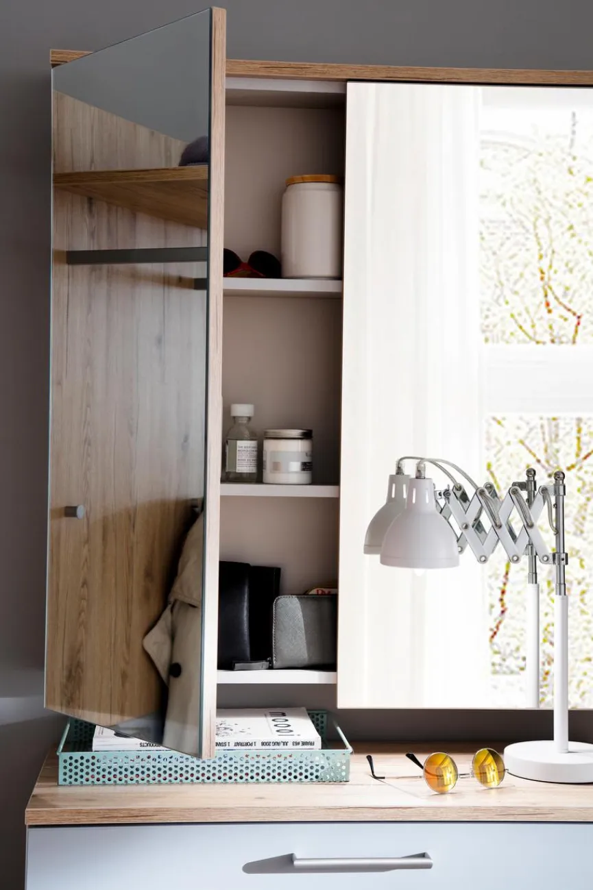 - Garderobe aus Garderobenpaneel, Kommode, Spiegelschrank, Akku-Sensorleuchte und Kleiderschrank