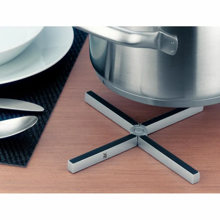 Der Topfuntersetzer Mister X der Marke WMF ist schick und funktional in einem. Das Gestell ist leicht glänzend und mit einem Logoaufdruck versehen. Auf der Oberseite befindet sich ein schmaler Gummiüberzug, auf dem Sie heiße Töpfe abstellen können. Dank der Breite können Sie auch große Töpfe und Pfannen auf dem Topfuntersetzer Mister X von WMF abstellen.
