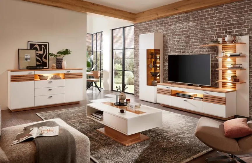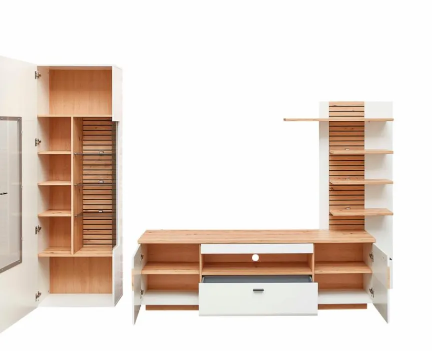 - Wohnwand aus Vitrine, TV-Lowboard und Wandpaneel