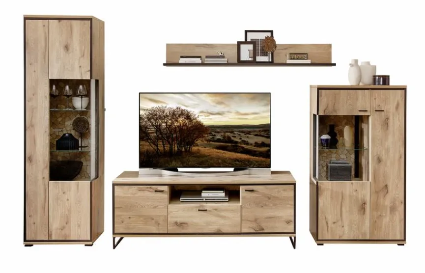 Die Wohnwand Ruben aus dem Hause Wohnconcept überzeugt durch eine edle, harmonische Gestaltung. Sie erhalten einen geräumigen Schrank und eine große Vitrine mit jeweils einem Glaseinsatz. Außerdem bietet Ihnen die Wohnwand Ruben ein leicht anzubringendes Wandboard und einen stabilen TV-Unterschrank für Ihr Entertainment-Set.