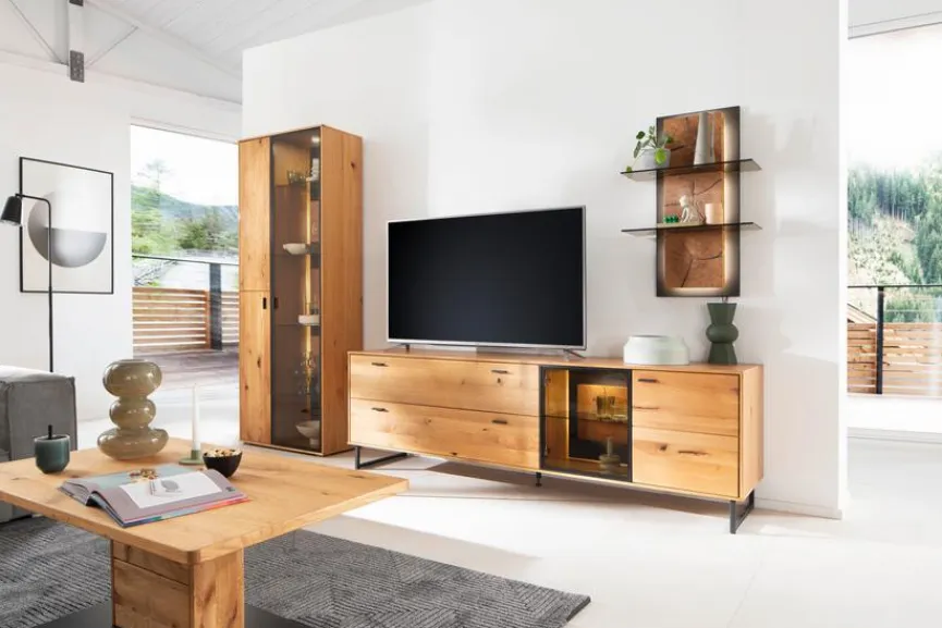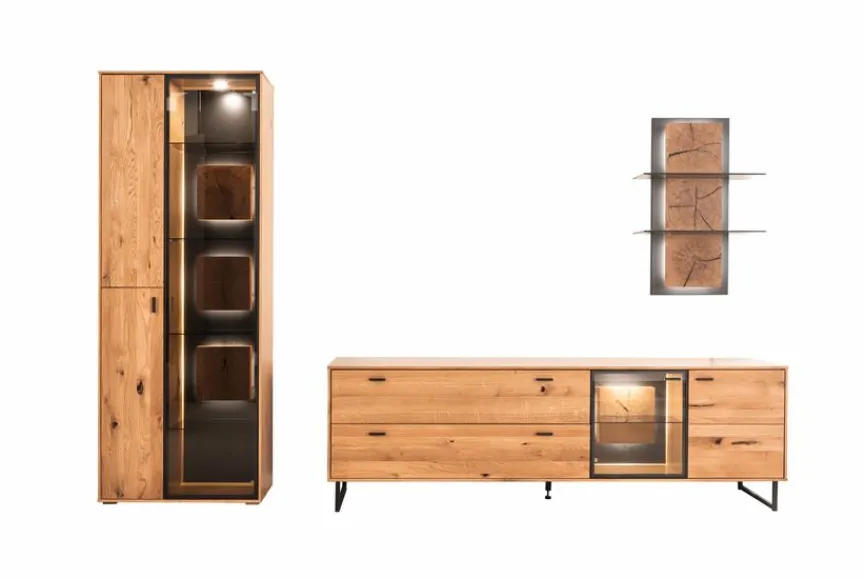 - Front aus Ast/Balkeneiche massiv, durchgehende Lamelle in Wildeiche geölt, Korpus aus Ast/Balkeneiche furniert in Wildeiche geölt