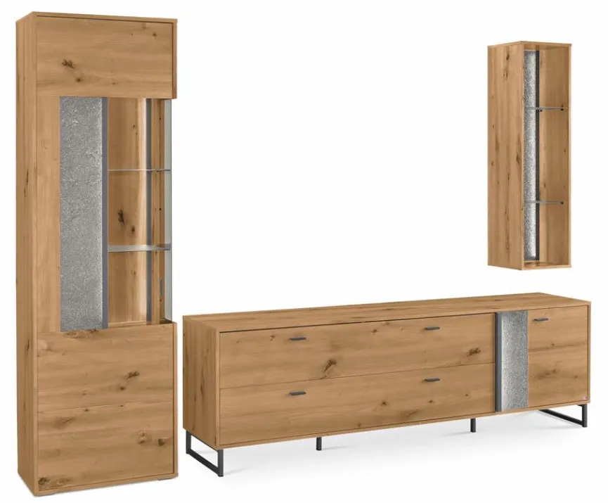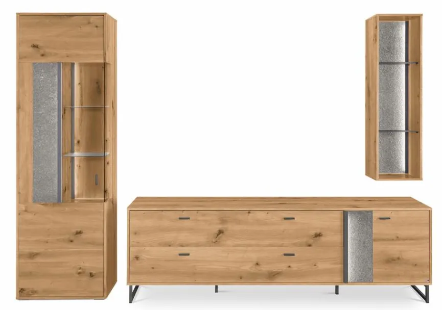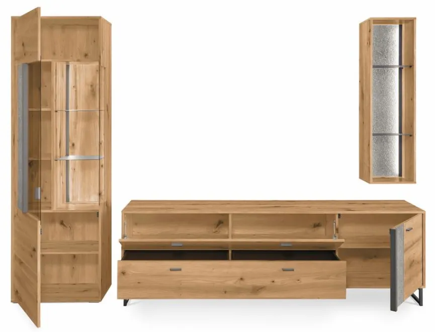 - Bestehend aus Vitrine, TV-Lowboard und Hängeregal