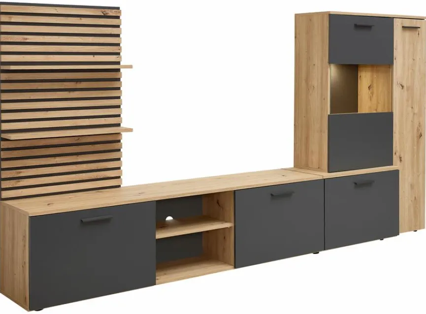 - Aus Holzwerkstoff (Spanplatte) mit kratzfester Melaminharzfolie in Artisan Eiche, Absetzung aus Holzwerkstoff (Spanplatte) mit kratzfester Melaminharzfolie in Anthrazit, Lamellen beim Wandboard aus Holzwerkstoff (MDF) in Artisan Eiche foliert