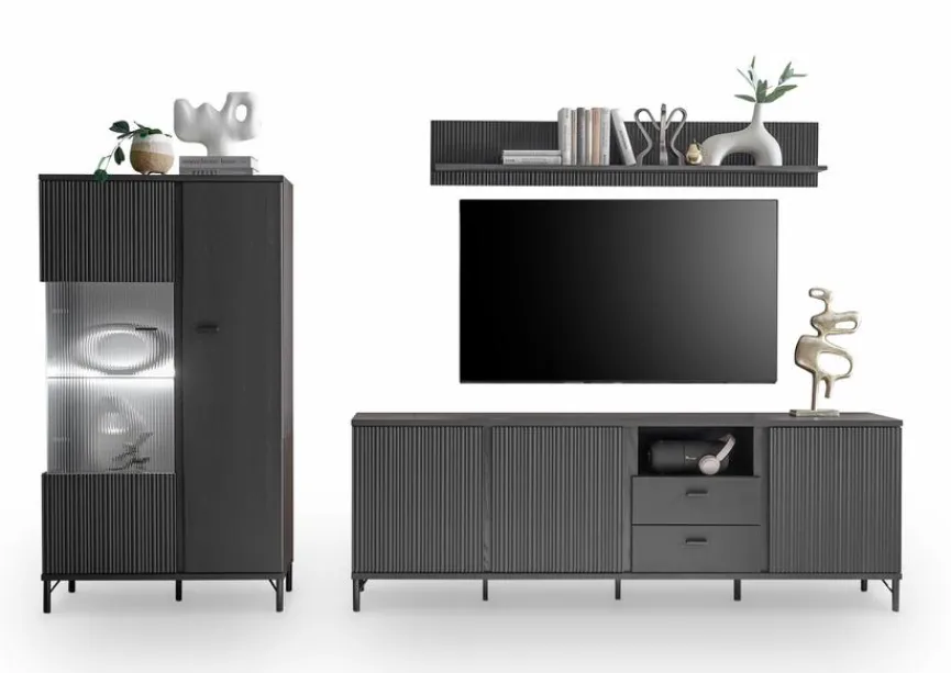 - Korpus aus Holzwerkstoff (Spanplatte) mit kratzfester Melaminharzfolie in Schwarz graphit, Front und Rillen aus Holzwerkstoff (MDF) mit hochwertiger Dekorfolie in Schwarz